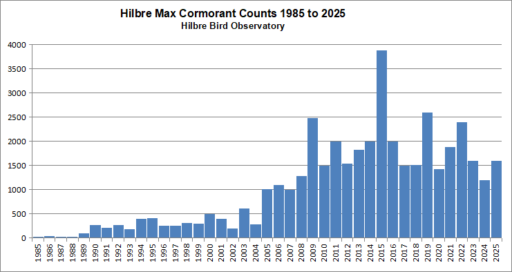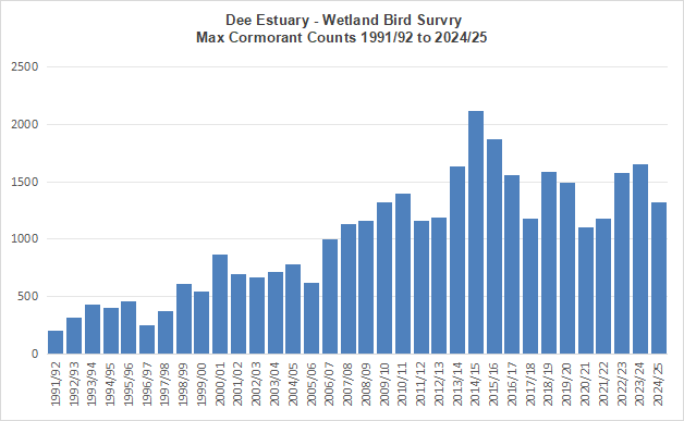 Ten years ago I wrote an article - Species Spotlight - Cormorant - in response to quite a dramatic change in the status of Cormorants on the Dee Estuary with a big increase in numbers, a change in the monthly distribution (peak numbers shifted from September to December) and the discovery of a large over-night roost on the edge of Parkgate marsh. These two bar charts bring us up to date: