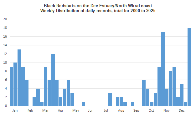 The next graph is the sum of all daily records, split into weeks, since the start of the century. You can see that despite the accumuation of 26 years of records these totals are still small, illustrating this species' rarity. But their liking for man made structures (walls, buildings etc.) means that when one is found they are easy enough to see and, more often that not, they will stay in the same area for a day or two and sometimes much longer.