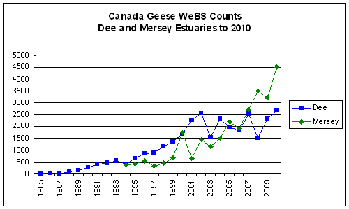 The graph below shows the rapid increase of Canada Geese, both on the Dee and Mersey estuaries over the past 20 years. It seems incredible that the max count for the whole of the Dee estuary was just two during the winter of 1987/88! During their steep rise counts on the Mersey always lagged behind those on the Dee, until the past four years when numbers first equalled, then over took those on the Dee. The count of 4,519 during June 13th 2010 is almost certainly the highest ever single count for this species in this country. No doubt there is considerable interchange between the two estuaries, on Oct 10th 2010 there was a combined total of 5,788. Counts on the Dee seem to have levelled out over the past few years although a new max of 2,688 was reached in October 2010, the largest numbers are usually seen at Burton Marsh, Burton Mere Wetlands and Oakenholt Marsh.