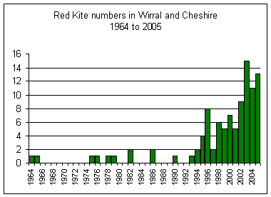 A Golden Age for Raptors - Part 2 Richard Smith You might not remember Part 1 as it was back in July 2003, when I did Peregrine and Buzzard. A remarkable tale of the huge increase in numbers of these species in our area, particularly of the Buzzard. This current article is about Red Kites and Ospreys, very different as these species don't breed in our area but are either, in the case of Red Kites, just wanderers from their breeding grounds or, in the case of Ospreys, passage migrants. However both species have seen large increases over the past forty years after recovering from extinction/near extinction as breeding birds in this country. You will see below whether this big rise in breeding pairs in the country as a whole is reflected in an increase in sightings in our area. I should note that I've never seen a Red Kite over the Dee Estuary area, and have seen just one Osprey. So despite their increase they are still rare birds, indeed, the Red Kite is still an official county rarity in Wirral and Cheshire (but not in Clwyd) - so if you see one please send in a description! As for the previous article I've covered the whole of Wirral and Cheshire in the discussion. Unfortunately Flintshire/Clwyd has not always published annual bird reports so coverage for here is far less comprehensive, and my collection only goes back as far as 1989. The total annual number of birds in the graphs below should be treated with some caution as it wasn't always clear from the Reports exactly how many birds were involved, and I've also included some records not supported by descriptions. However, I'm confident the figures I've ended up with are reasonably close to the true number. Red Kite: