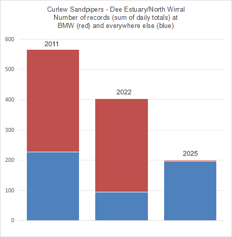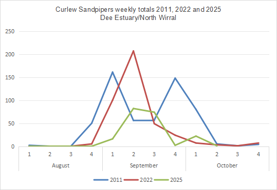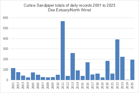I'm told that Norway had the best Curlew Sandpiper passage for over 10 years (Pers. Comm. Jim Wilson, 21/10/25) and it seems likely that, as they flew down the Norwegian west coast, they were pushed out into the Atlantic by a fresh easterly wind and consequently ended up in the northern isles and extreme west coasts of Britain. Here, on the Dee Estuary, we have usually seen our first juveniles by the end of August but this year they were a bit late with the first one off Thurstaston on the 3rd, and the first multiple record not being seen until the 6th which ties in with the large arrival across the country over the weekend of the 6/7th.