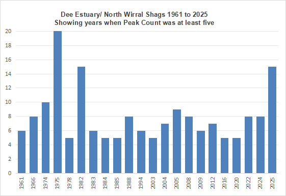 Ten years ago I wrote an article - Species Spotlight - Cormorant - in response to quite a dramatic change in the status of Cormorants on the Dee Estuary with a big increase in numbers, a change in the monthly distribution (peak numbers shifted from September to December) and the discovery of a large over-night roost on the edge of Parkgate marsh. These two bar charts bring us up to date: